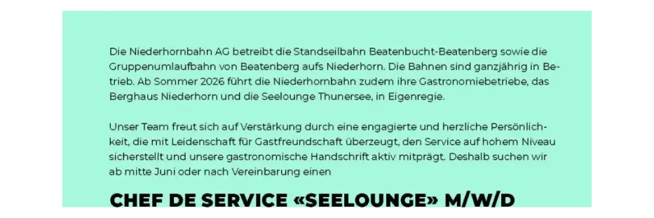Ab Sommer 2026 führt die Niederhornbahn zudem ihre Gastronomiebetriebe, das Berghaus Niederhorn und die Seelounge Thunersee, in Eigenregie. Unser Team freut sich auf Verstärkung durch eine engagierte und herzliche Persönlichkeit, die mit Leidenschaft für Gastfreundschaft überzeugt, den Service auf hohem Niveau sicherstellt und unsere gastronomische Handschrift aktiv mitprägt. Deshalb suchen wir ab mitte Juni oder nach Vereinbarung einen